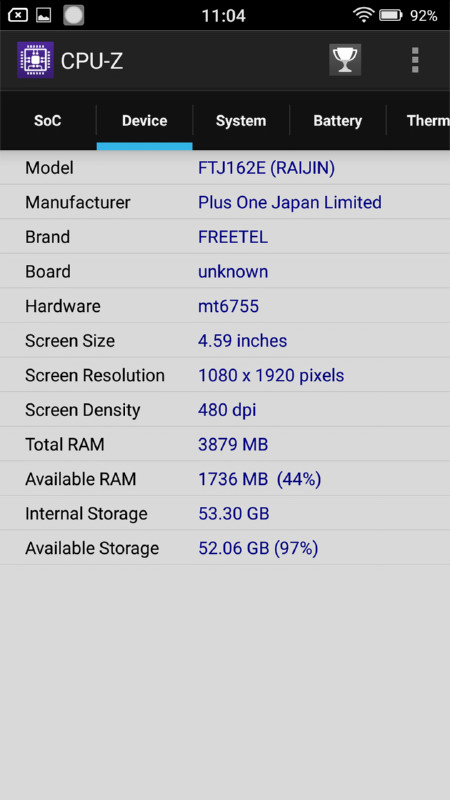 ディスプレイの実サイズやRAIJINの最大の特長でもあるバッテリー容量については、ベンチマークテストの結果には結びつかないので、特に考慮しませんが、4GB RAMというミドルスペックのスマホとしては相当に大きいRAMがベンチマーク結果に影響されるかがポイントになりそうです。