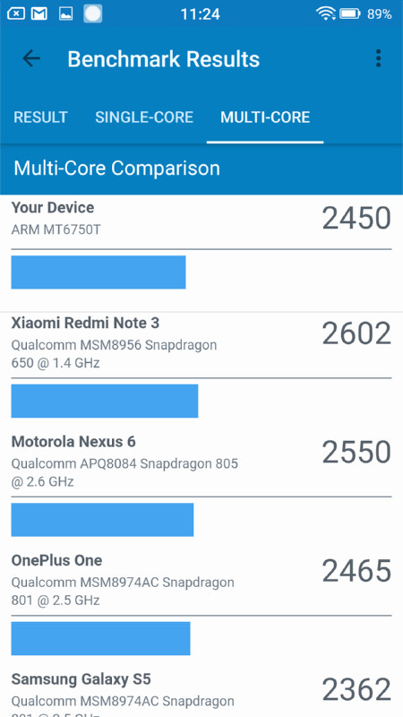 一方で、マルチコアでのスコアは2450とそれなりの数値(とはいえ、2年前に発売された「Galaxy S5」とほぼ同数値ですが)が出ており、マルチコア処理をうまく使うことで、1コア当たりの低めの性能をカバーできるのではないかと思われます。