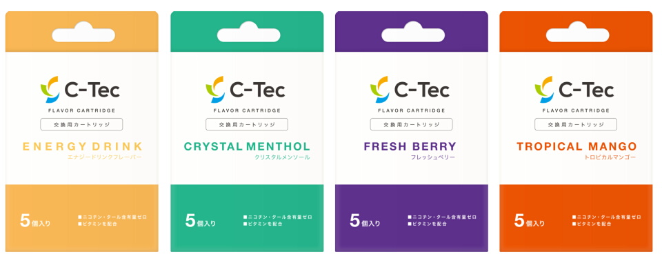 スターターキットにフレーバーカートリッジ(エナジードリンクフレーバー)が1個同梱しますが、追加の「C-Tec 交換用フレーバーカートリッジ」は4月上旬発売予定です。