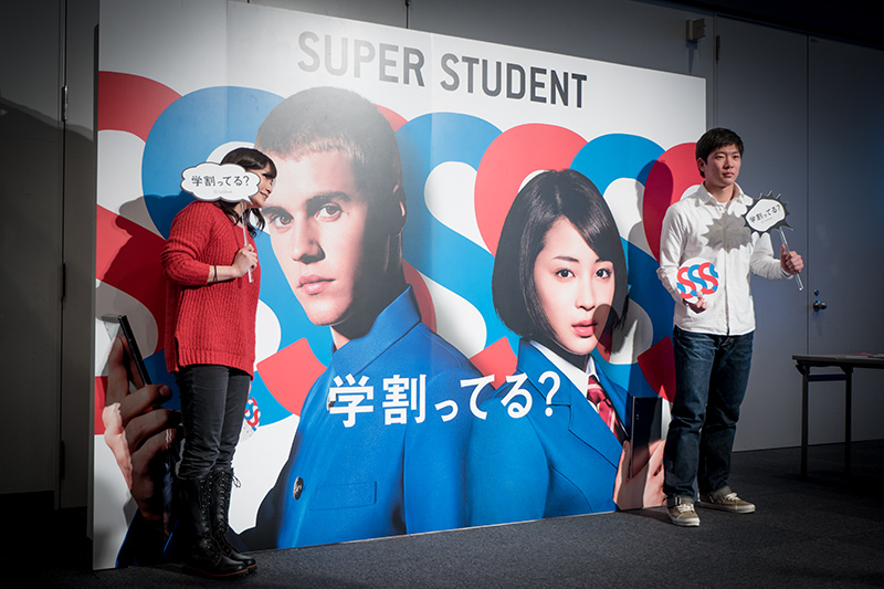 撮影終了後は、お父さんのサプライズゲスト登場に会場が沸く。イベント終了後は、会場にセットされた、お父さんや学割ってるのCMをイメージしたセットで記念撮影を楽しんでいた。