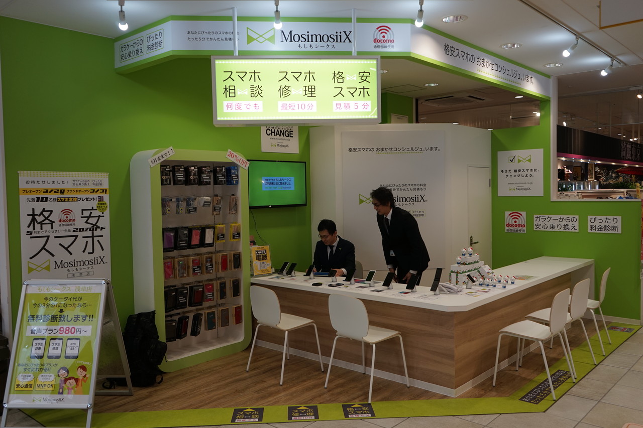 仮想移動体通信事業者(MVNO)として実店舗でのサービスに強みを持つ携帯電話サービス「もしもシークス」を展開しているエックスモバイル。同社は3月31日に東京・浅草の商業施設「浅草ROX 3G」の1階に都内初出展となる「もしもシークス浅草店」をオープンしました。