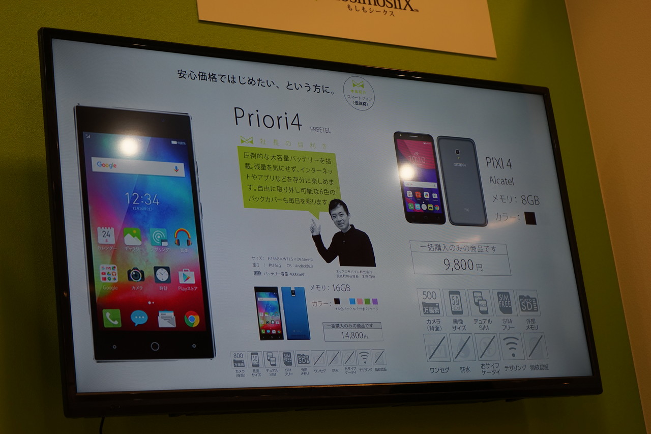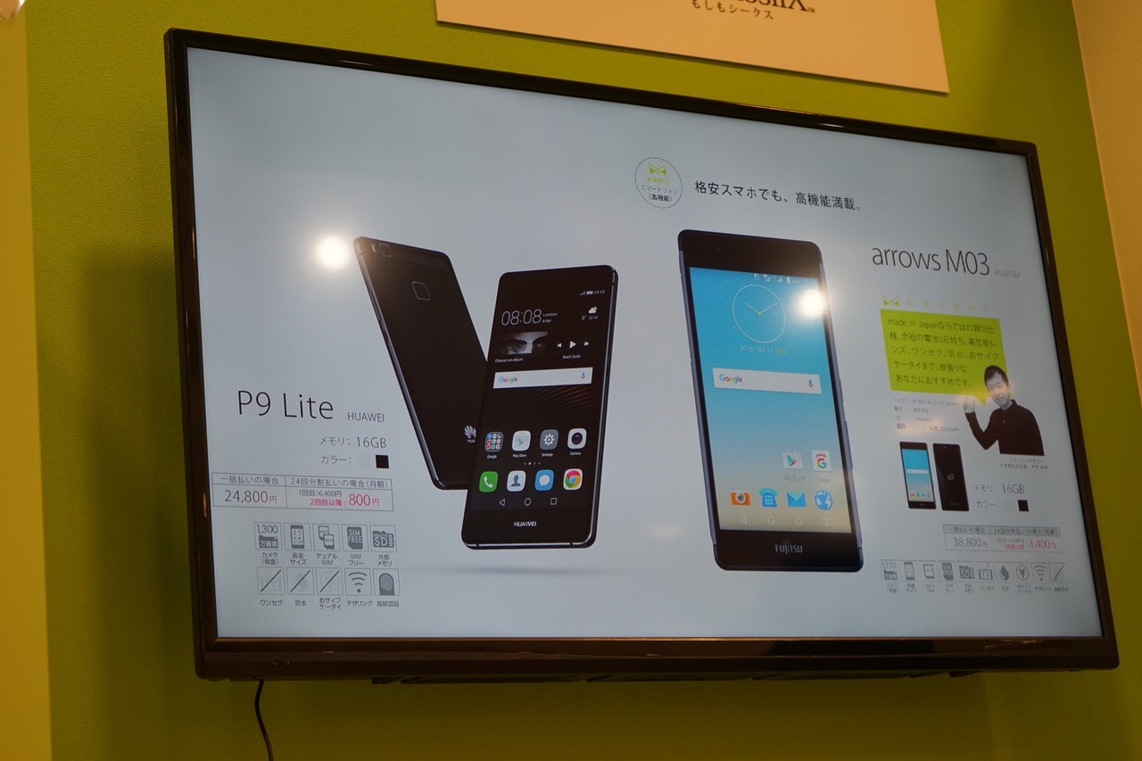 またミッドレンジスマホとしてファーウェイ製「HUAWEI P9 lite」(24,800円)や富士通コネクテッドテクノロジーズ製「arrows M03」(38,800円)、ローエンドスマホとしてプラスワン・マーケティング製「FREETEL Priori 4」(14,800円)やTCLコミュニケーション製「alcatel PIXI 4」(9,800円)も販売開始します。