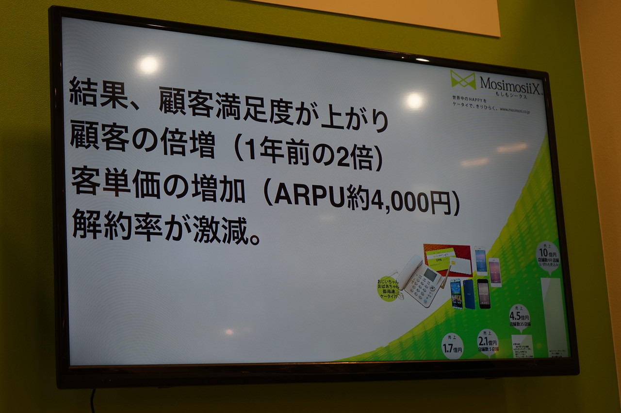 今回の発表は、前回の2016年4月1日に実施した発表会から丸々1年が経過しており、木野社長は「他社さんはたくさん発表会していたけど、うちではそんな余裕がなかった」と言うように、社内では「公式ショップでの即時開通」や「地方出店の強化」、「カスタマーサポート営業時間の拡大」などのサービス改善を行ったほか、高品質の仮想移動体サービス提供者(MVNE)に会社負担で全顧客へのSIMカードの無償交換をしたり、かけ放題を国内まわりに変更(コストは1.5倍でも価格据え置き)するなど、顧客満足度向上を図った結果、顧客の倍増や客単価の増加に加えて解約率が激減するなどの結果を得られたとしています。