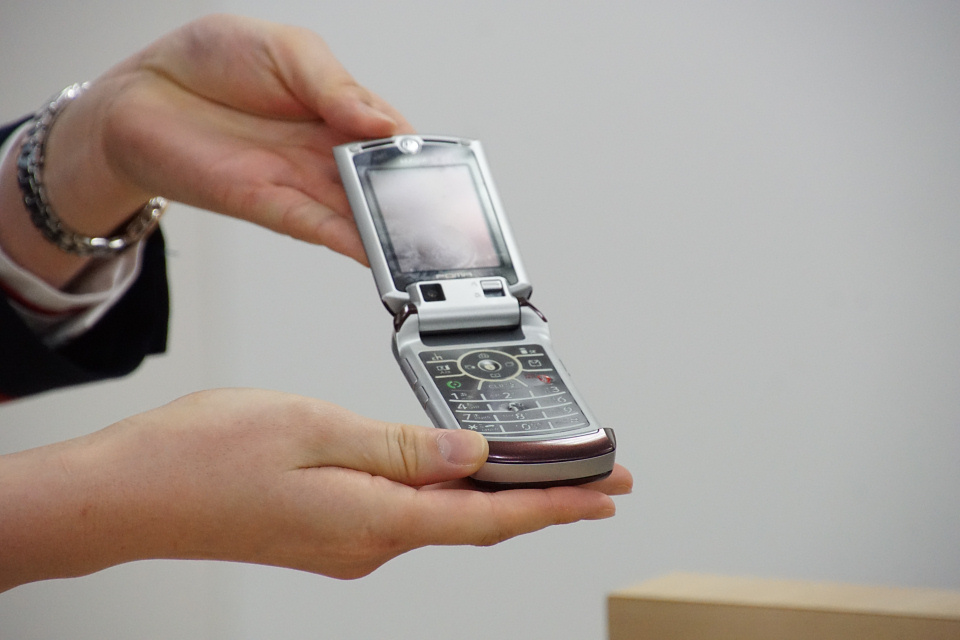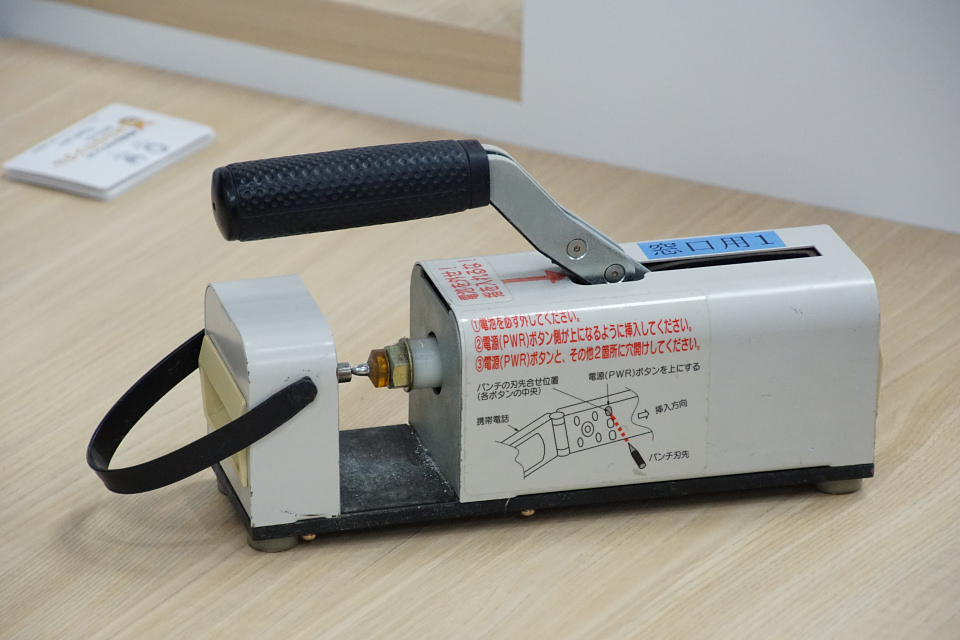 その後松田氏や山田氏が個人で使用していた古いケータイを持参して登壇、ドコモショップのスタッフの手により実際にリサイクル手続きが行われました。持参されたケータイはバッテリーを外されたのちに専用のプレス機によって穴が開けられ、使用不可能な状態となって店舗へ引き渡されます。この際リサイクルの証明として「みんなのメダルプロジェクト」のリサイクルカードが発行されます。
