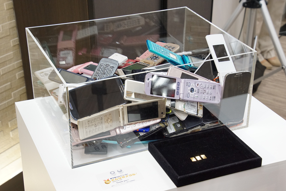 前述したように東京2020オリンピック・パラリンピックで使用する金メダルは100%リサイクル金属によって製造されることを目標としています。大会全体で使用する金の総量は約10kgで、製造時のロスを含めると約4倍の40kgが必要となるため、単純計算では約133万台のケータイが必要となります。