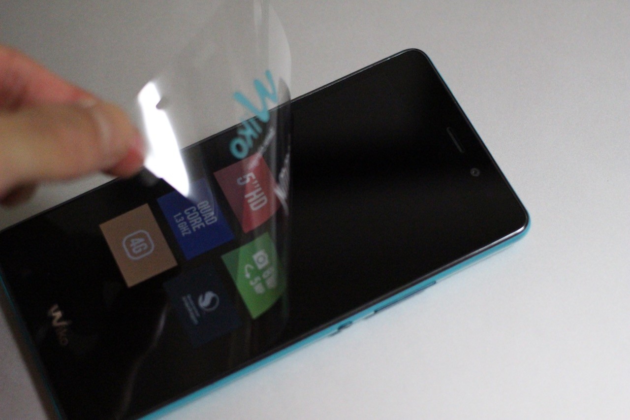 Tommyの本体は半透明な袋に入っているほか、前面には「Wiko」や「Tommy」といったメーカー(ブランド)名や製品名、5"HDなどの製品概要が書かれた透明な保護シートが貼られています。さすがに画面が見づらいのでシートを剥がします。