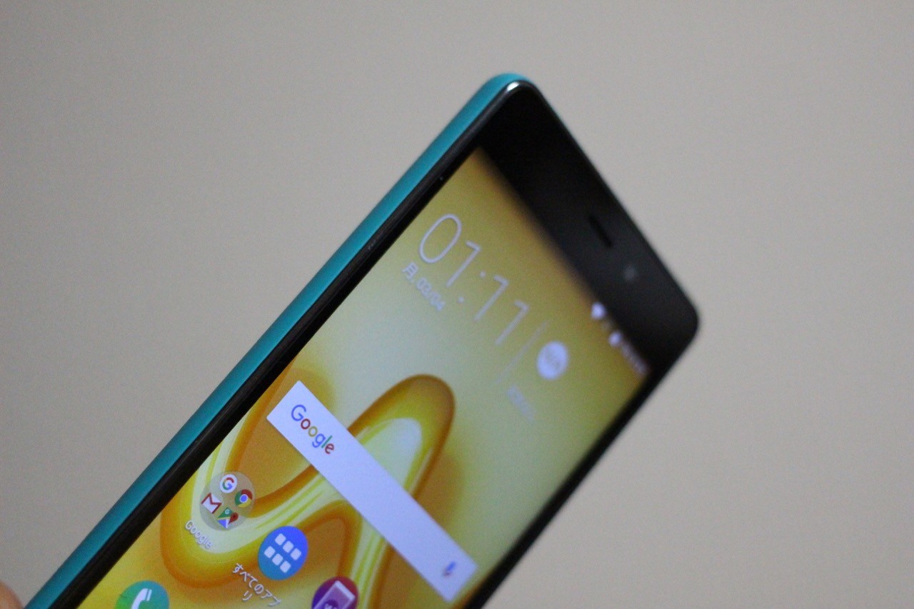 右側面にある電源キーを長押しすれば電源ONになります。前面にはディスプレイのほか、約500万画素フロントカメラや通知用LED、近接センサー、光センサーなどが配置。ディスプレイの周りの縁(ベゼル)は各色ともにブラック。