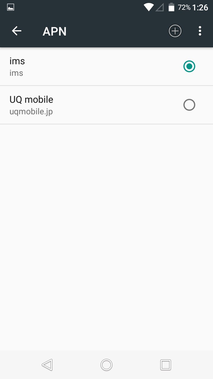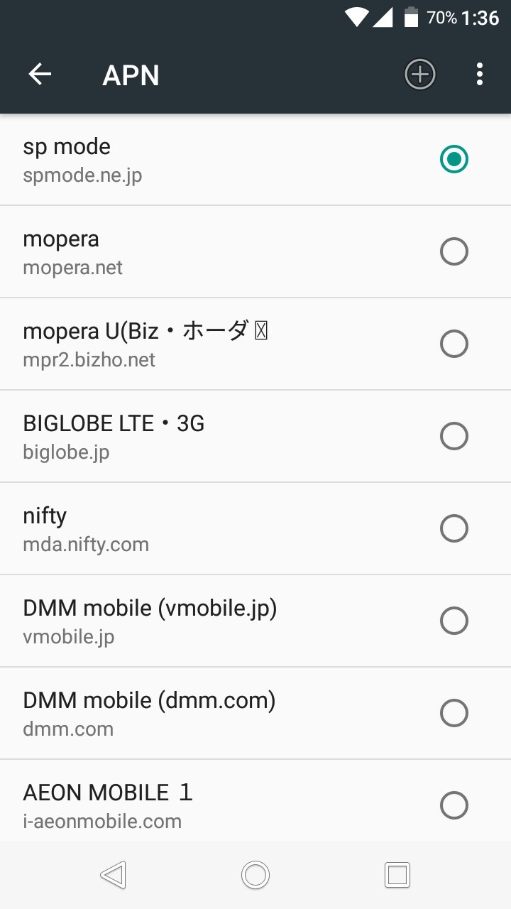 プリセットされたAPN(アクセスポイント)はau系ではau(ims)とUQ mobileのみで、mineo(Aプラン)やIIJmio(タイプA)などは手入力することに。また、NTTドコモ系でもLINEモバイルなどは入ってなかったものの、珍しくspモードがありました。