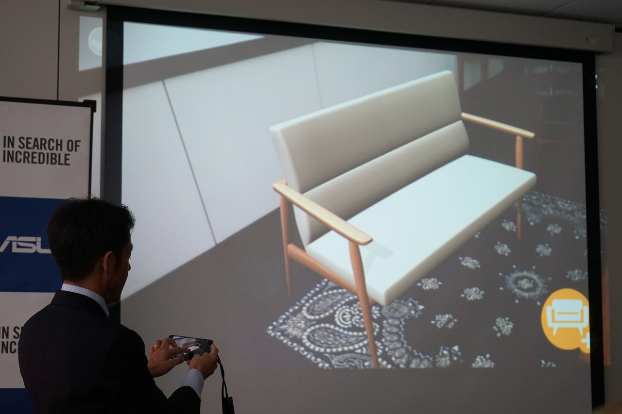 現在でも試せる実例として挙げられたのが「RoomCo AR」を用いた家具配置機能です。RoomCo ARはリビングスタイルが提供するアプリで、ZenFone ARで対応しているProject Tangoの他にも「Microsoft HoloLens」などでAR・VRソリューションを提供しています。無印良品やIDC大塚家具などを始めとした25社29ブランドの3Dデータベースを提供しており、ユーザーがProject Tango対応機種でこのアプリを使用することによって気軽に家具の配置体験をすることができるとしています。