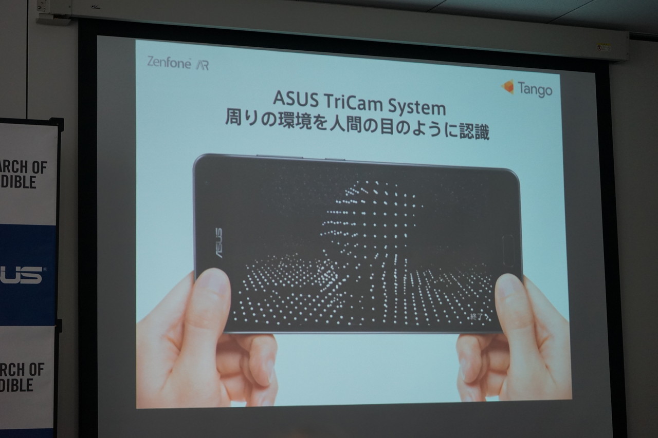 AR技術であるProject Tangoに対応したZenFone ARの背面には約2300万画素のソニー製メインカメラモジュール「IMX318」の他にモーショントラッキングカメラと深度カメラ(赤外線)の用途の異なる3つのカメラモジュールを搭載しており、ASUSはこれを「TriCam」システムと呼んでいます。これらのカメラで取得した情報をもとに、物体や室内の床・壁面などを認識することによってAR技術を実現させています。