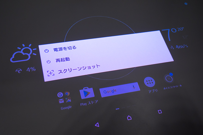 電源キーを長押しするとXperiaスマホおよびタブレットでお馴染みのダイアログが表示される。もちろんスクリーンショットも可能だ。
