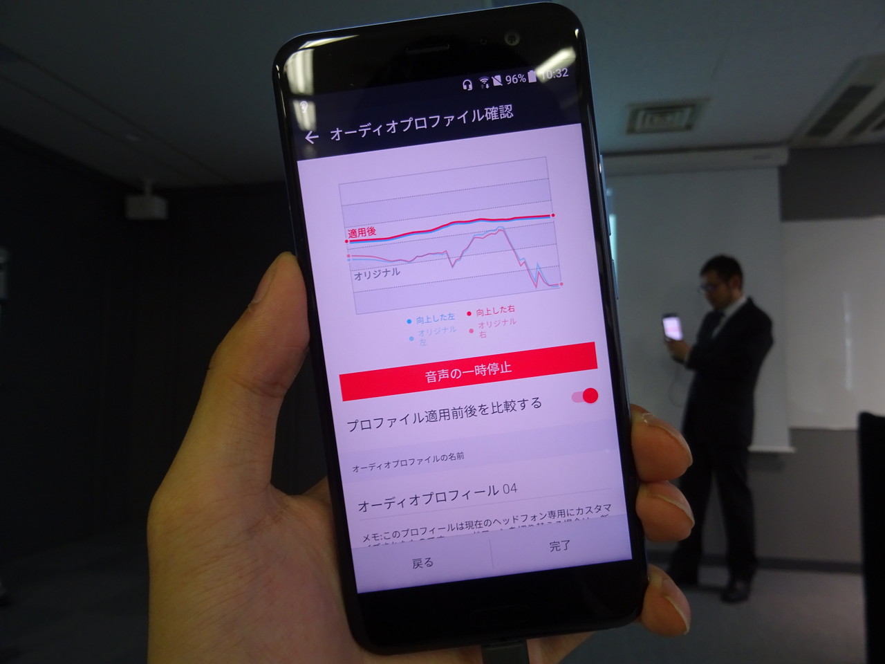 USB Type-C端子に接続するハイレゾ対応イヤホン「HTC Uソニック・ハイレゾ(以下、U Sonic)」が製品に付属しており、ノイズキャンセリングや自動音響調整機能を備えています。約10秒ほどの自動音響調整を行うことで、人の内耳を分析して最適な音質に設定することも可能で、視聴してみると確かに重低音や高音の厚みが増しており、快適にリスニングすることが可能でした。