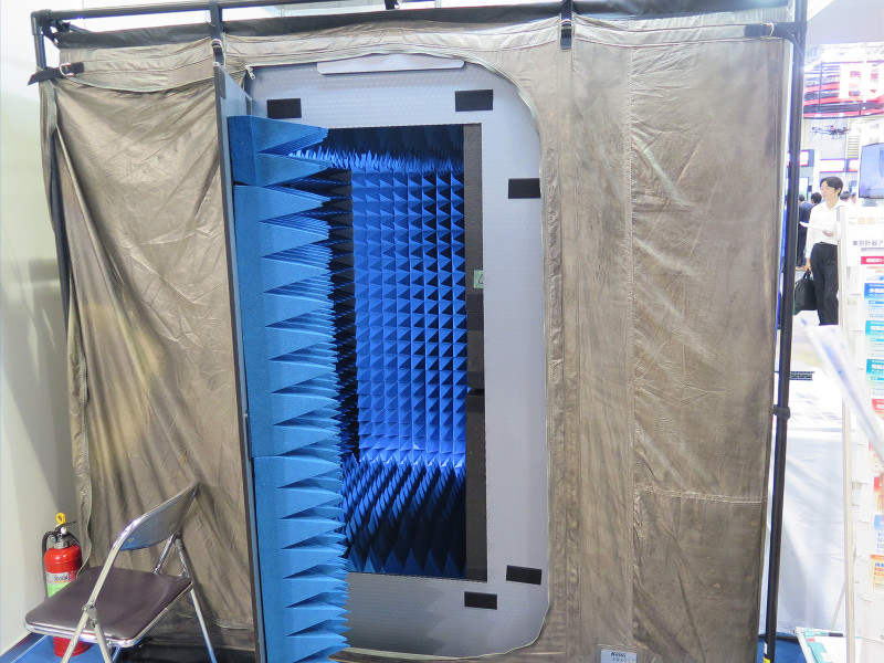 説明員によると、主な用途としては「電波法令の技術基準に適合(技術基準適合証明、いわゆる「技適マーク」)を取得していない電子機器のテストなどを行う」といったもので、価格は基本セット(フレームとクロス材の組み合わせで、2m四方モデルの場合)46万円からということです(要見積もり)。