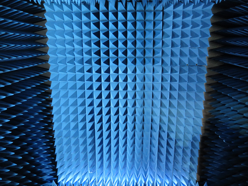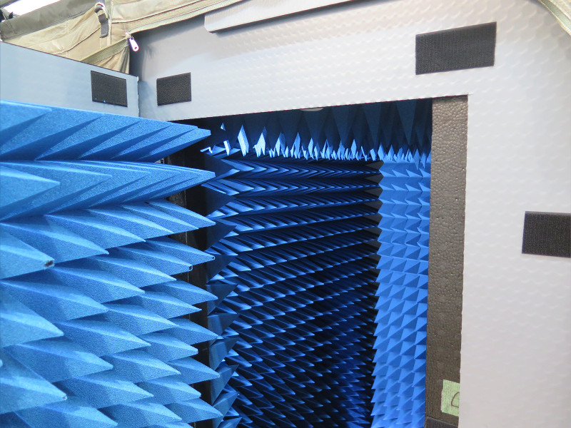 テント内部。壁一面の青い突起状のものが電波吸収体(スポンジ素材に特殊な染料が塗られている)