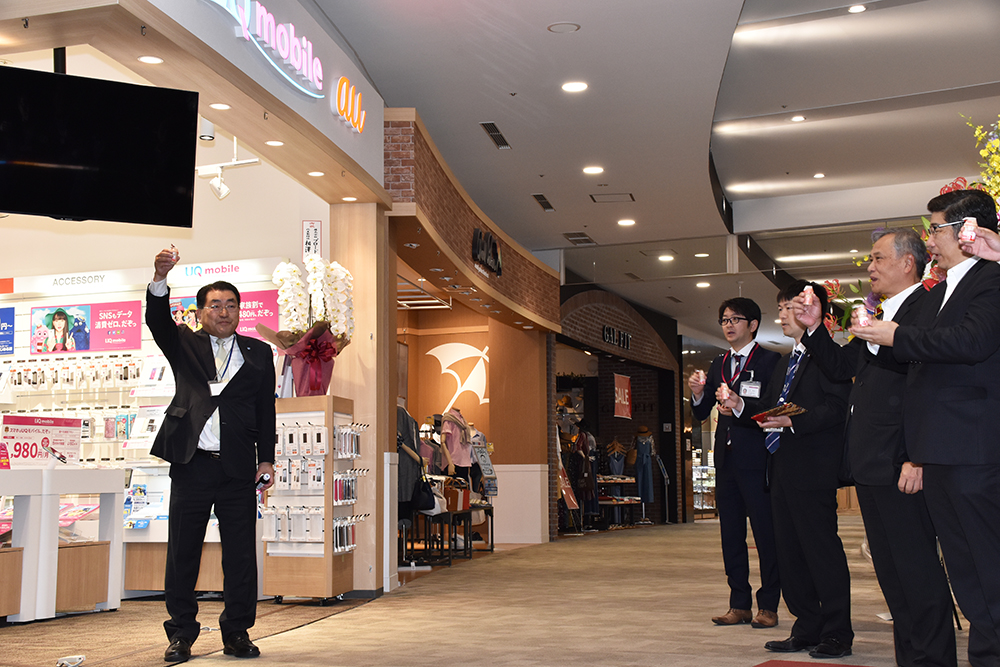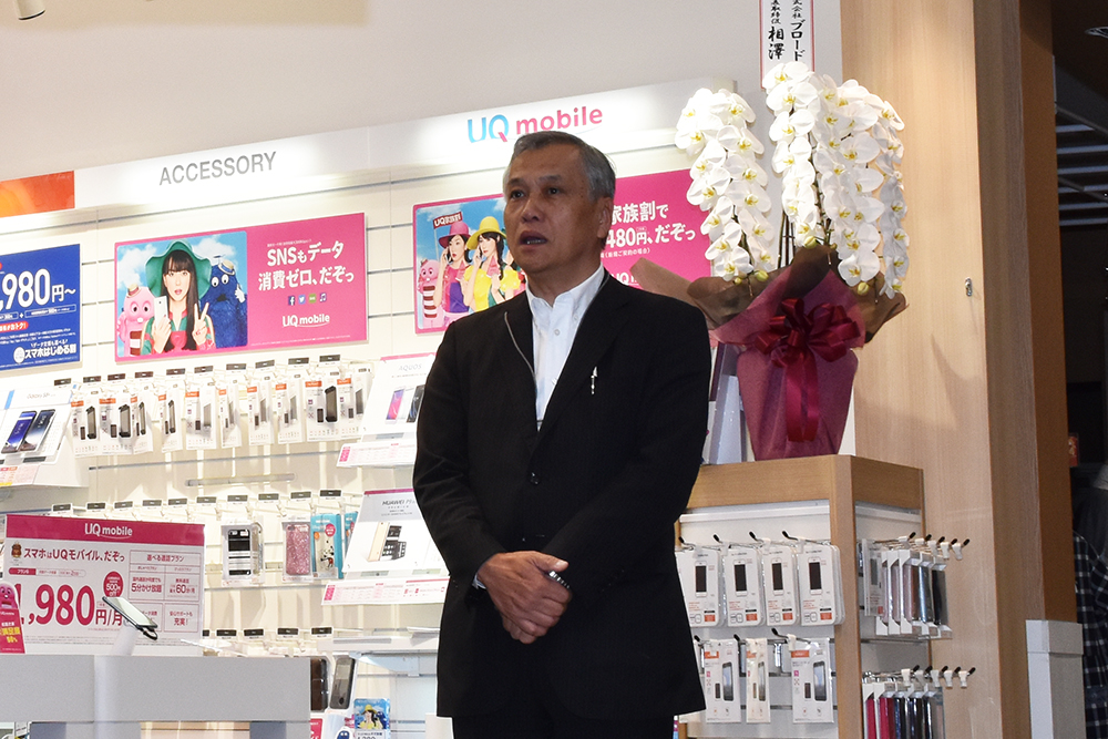 セレモニーに駆けつけたUQ執行役員・副社長の菱岡 弘 氏からは、祝辞の中で「店舗をつくるだけで契約者数が増えるという簡単なことではない。スタッフそれぞれが日頃からしっかり目的を持ち、お客さまへの対応、そして販促活動に取り組んで欲しい」といった言葉が贈られました。