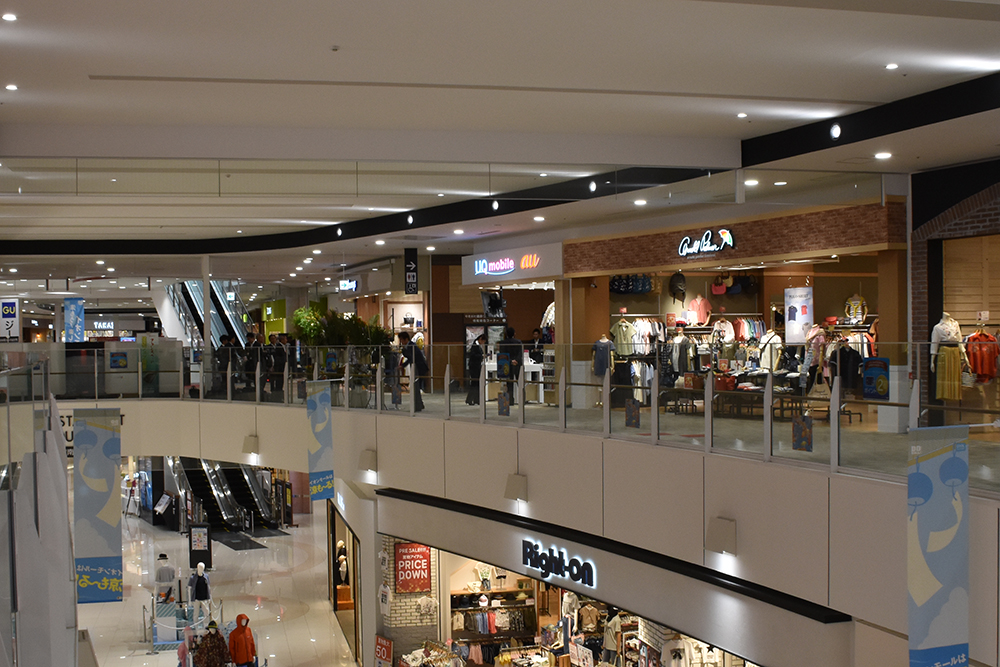 屋上駐車場(3階)から中央エスカレーターで2階に降りると、ちょうどエスカレーターの降り口正面すぐ奥に見える場所への出店。店舗の2面が通路に面する場所でもあり、モールを訪れた人にも気づいてもらいやすい場所ではないかと感じました。