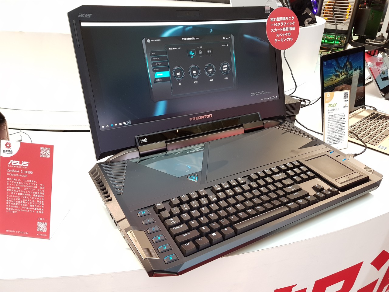 一方、同じく台湾メーカーであるAcer(エイサー)は、デスクトップ向けのIntel Core i7プロセッサや2基のNVIDIA GeForce GTX 1080を搭載した妥協無きゲーミングノートPC「Predator 21 X」を参考展示していました。21インチの湾曲ディスプレイに目を引かれる本体は、まるで装甲車を彷彿とさせる無骨でデザインでユーザーを魅了します。