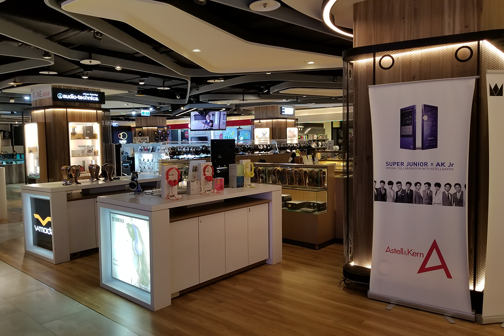 1階はフロア中央に大きなイベントスペース、そしてそれを囲むように、主にスマホを含む携帯電話関連製品を取り扱うメーカーの直営店が並びます。