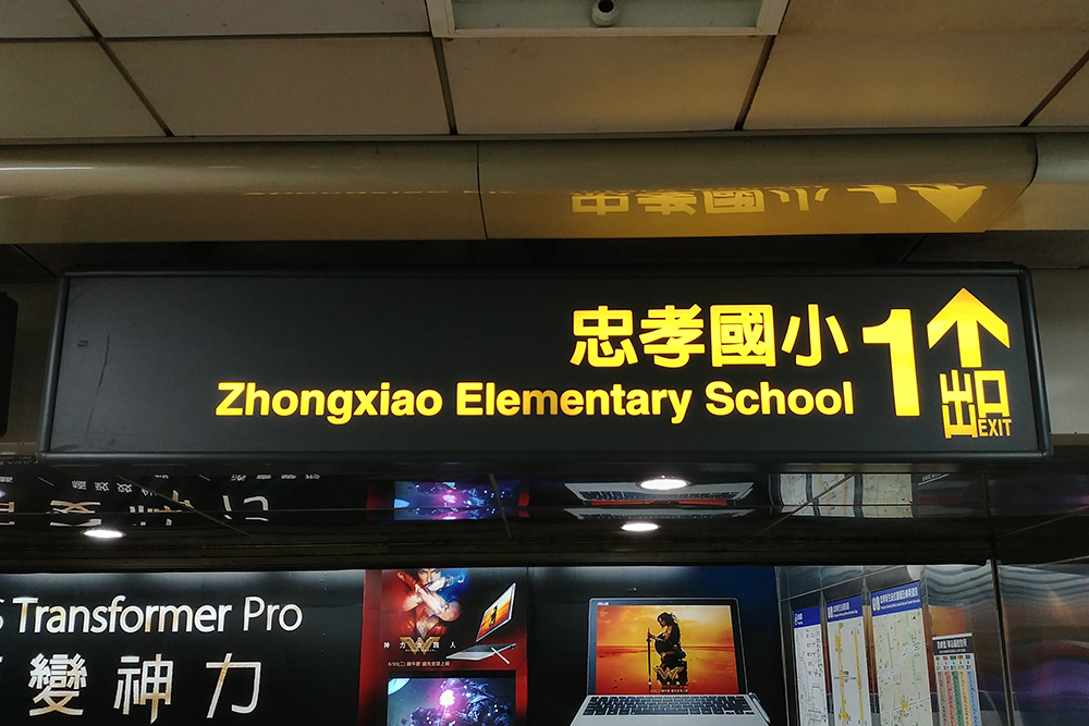 忠孝新生駅でMRTから下車したら、地上へつながる7つの出口(出口1~出口7)のうち、出口1(忠孝國小と書かれている)をめざします。