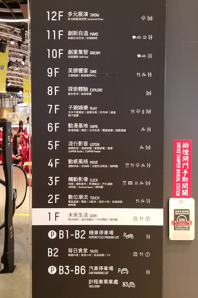 ここからはそれぞれを順番に見てきましょう。まずは三創生活園區から。三創生活園區は2015年5月に完成し、まだオープンして2年と新しい商業ビル。スマホやパソコン(PC)、音響機器などを取り扱うメーカーの直営店がテナントとして多く出店しています。