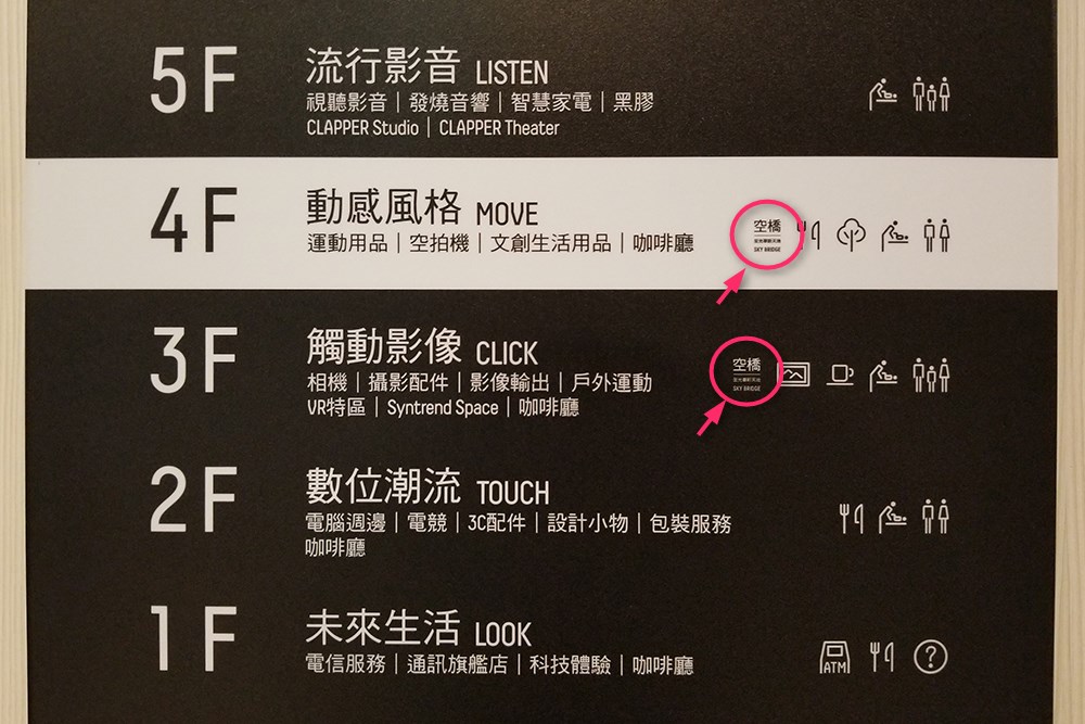 なお、三創生活園區はこの後に紹介する光華商場と空中歩道を通じて建物がつながっています。空中歩道が用意されているのは3階・4階。歩道は密閉された空間でこそありませんが、屋根付き。雨天時はとくに、カサを差して1階から移動するより、屋根付きのこの通路を使うほうが便利かもしれません。