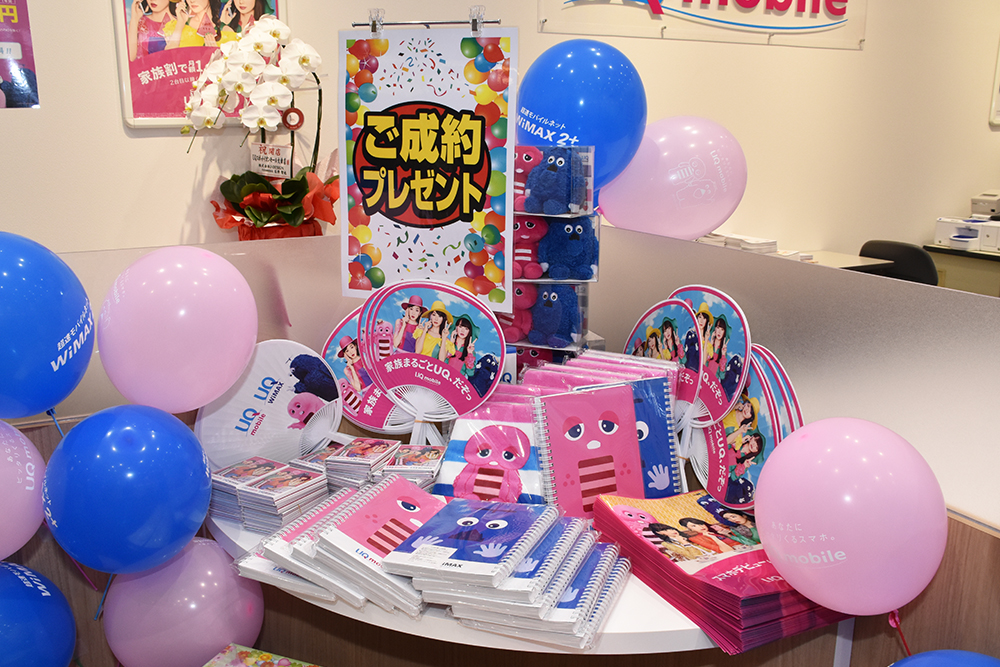 新規契約の成約者を対象としてUQオリジナルグッズ(非売品)を含むプレゼント、また新規2台以上およびUQ家族割と指定の料金プランに申し込んだ成約者には3,000円分のギフトカードをプレゼント(いずれも先着順)といった企画を用意。この他に抽選会なども実施するそうです。
