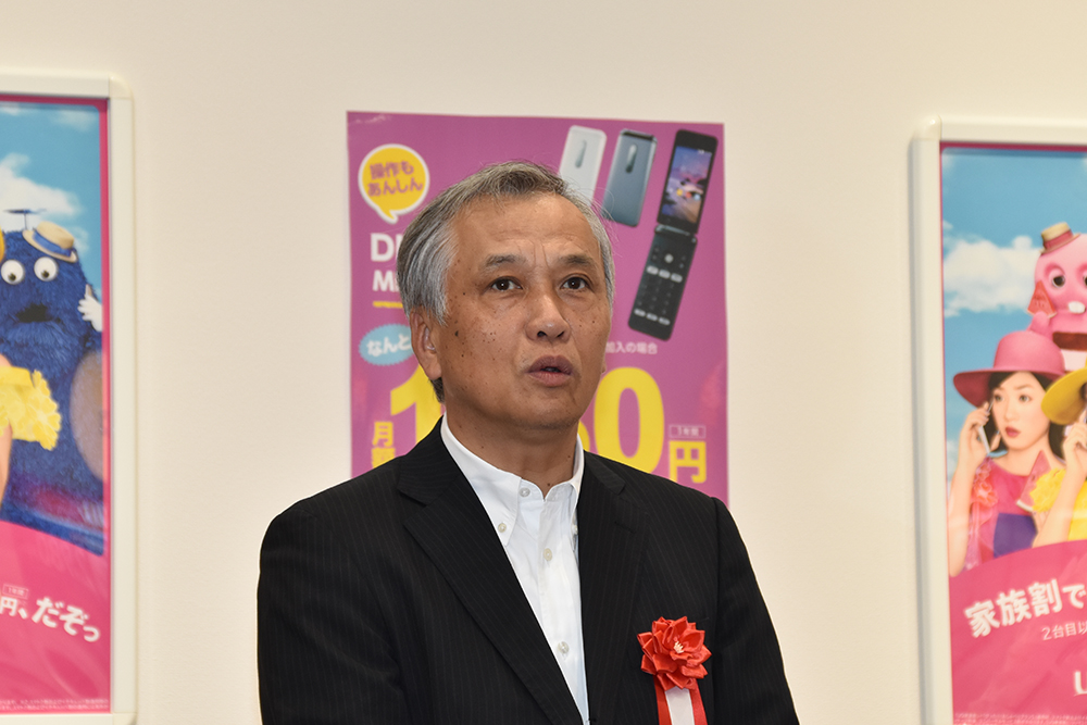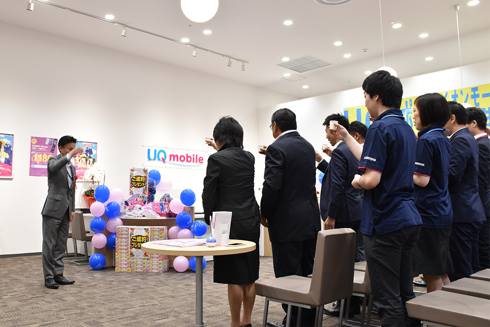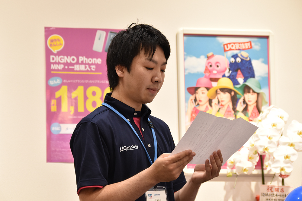 オープン初日は開店となる朝9時に備え、事前にオープニングセレモニーを開催。来賓として駆けつけたUQ執行役員副社長の菱岡氏は、先日発表されたばかりのau新料金プランについても触れつつ「(ぱっと見で同じような料金に見えても)実態としてはまだ大きな違いがある。自信を持って販売して欲しい」と祝辞の中で述べました。