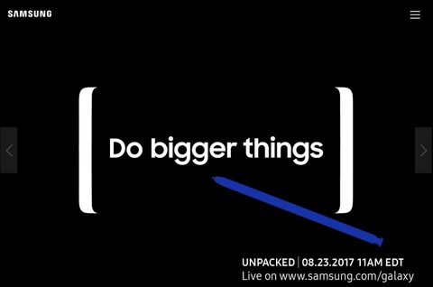 予告には「Do bigger things」というキャッチコピーと、Sペンと見られるスタイラス(ペン)と「Galaxy S8」や「Galaxy S8+」のような狭額縁デザインのスマートフォン(スマホ)のようなイメージが描かれており、次期「Galaxy Note」シリーズ(「Galaxy Note8」(仮称))が発表されると見られています。