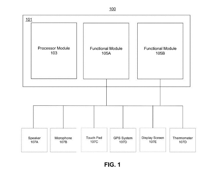 特許申請の内容を確認すると、シャーシにProcessor ModuleとFunctional Moduleを搭載していることからチップセット(SoC)ですら交換できるという徹底ぶりが伺えます。さらにFunctional Moduleには、スピーカーやマイク、タッチパッド、GPS、ディスプレイ、温度計などのセンサーもモジュールかされているようです。