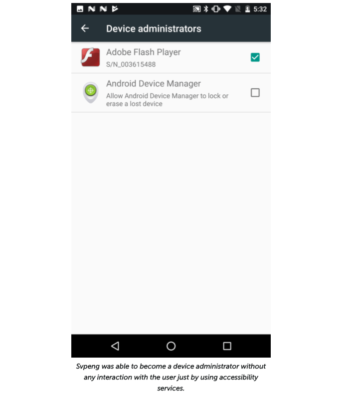 さらにこのトロイの木馬は「Adobe Flash Player」アプリに偽装して端末にインストールされます。なお、今回発見された新種は現在提供されている最新のAndroidセキュリティーパッチを適用していたとしても感染すると動作してしまうことが確認されています。そのため、今のところは被害は限定的ではありますが、現状対策する手立てがありません。さらにGoogleがセキュリティー対策パッチをリリースしたとしても、実際にAndroid搭載製品にはメーカーがそのパッチを配信するまで時間がかかったり、そもそも配布するかどうか分からないといった非常に深刻な問題が存在しているだけに安心することができません。