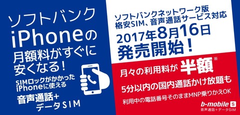 日本通信は9日、SIMロックを解除することなくSoftBankのiPhoneシリーズで使える音声通話サービス付き格安SIM「b-mobile S スマホ電話SIM」を2017年8月16日(水)午前10時より提供開始すると発表しています。