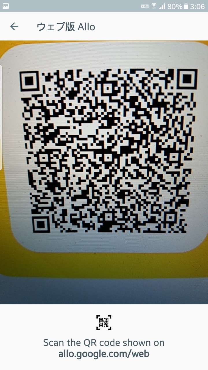 それから今度はPCなどのChromeにて https://allo.google.com/web を開き、表示されているQRコードをスマホなどで読み取ります。すると、PCなどのChromeで開いているページが自動的にログインされ、PCなどでAlloが利用できる状態となります。