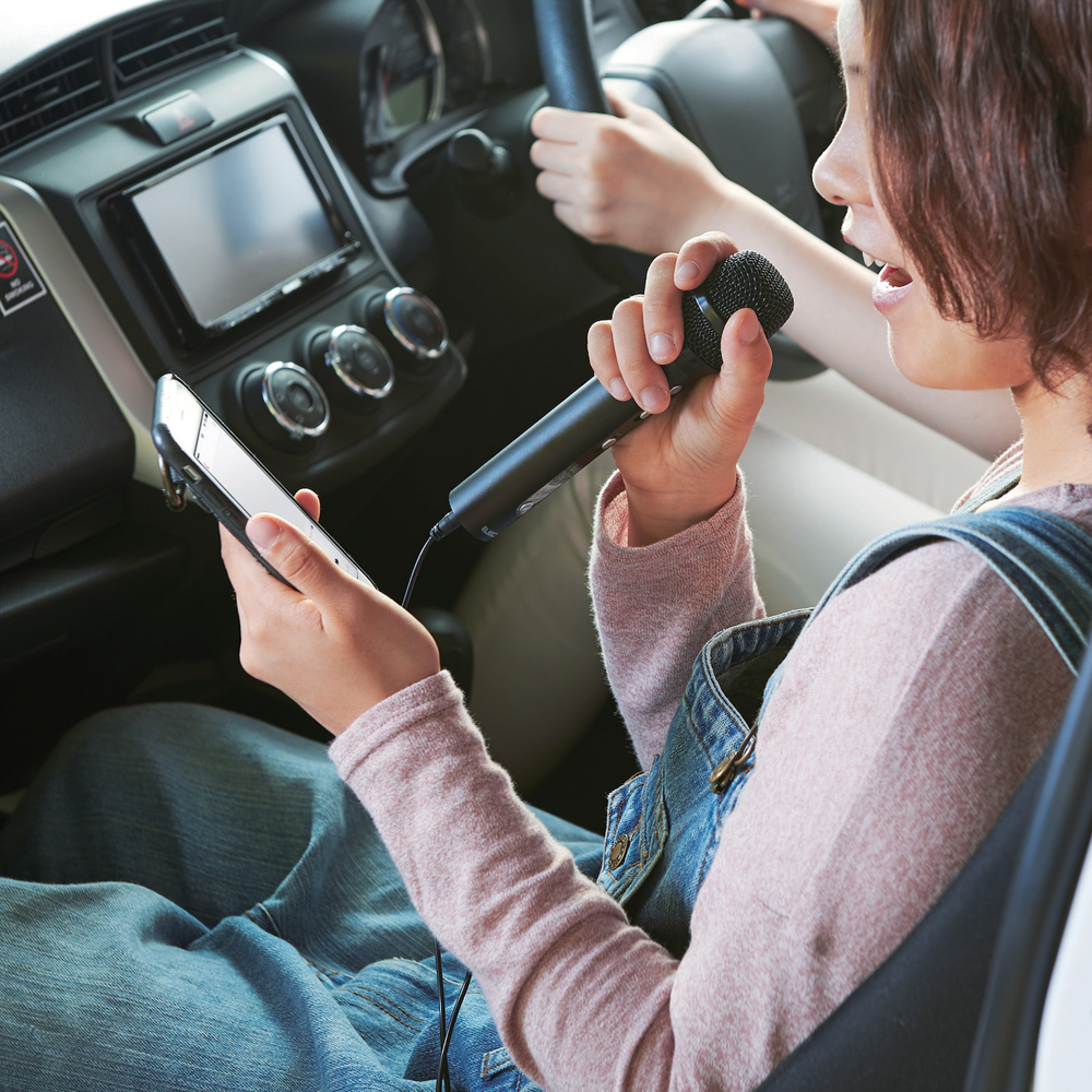 マイク本体に音量とエコーの調整機能があります。またFMトランスミッター搭載タイプはマイク本体にFMトランスミッター機能が内蔵されていて、カーステレオにワイヤレスで接続でき、車の中でもカラオケが楽しめるというもの。車での長時間移動や渋滞中でも、みんなで楽しく盛り上がることができると紹介されています。