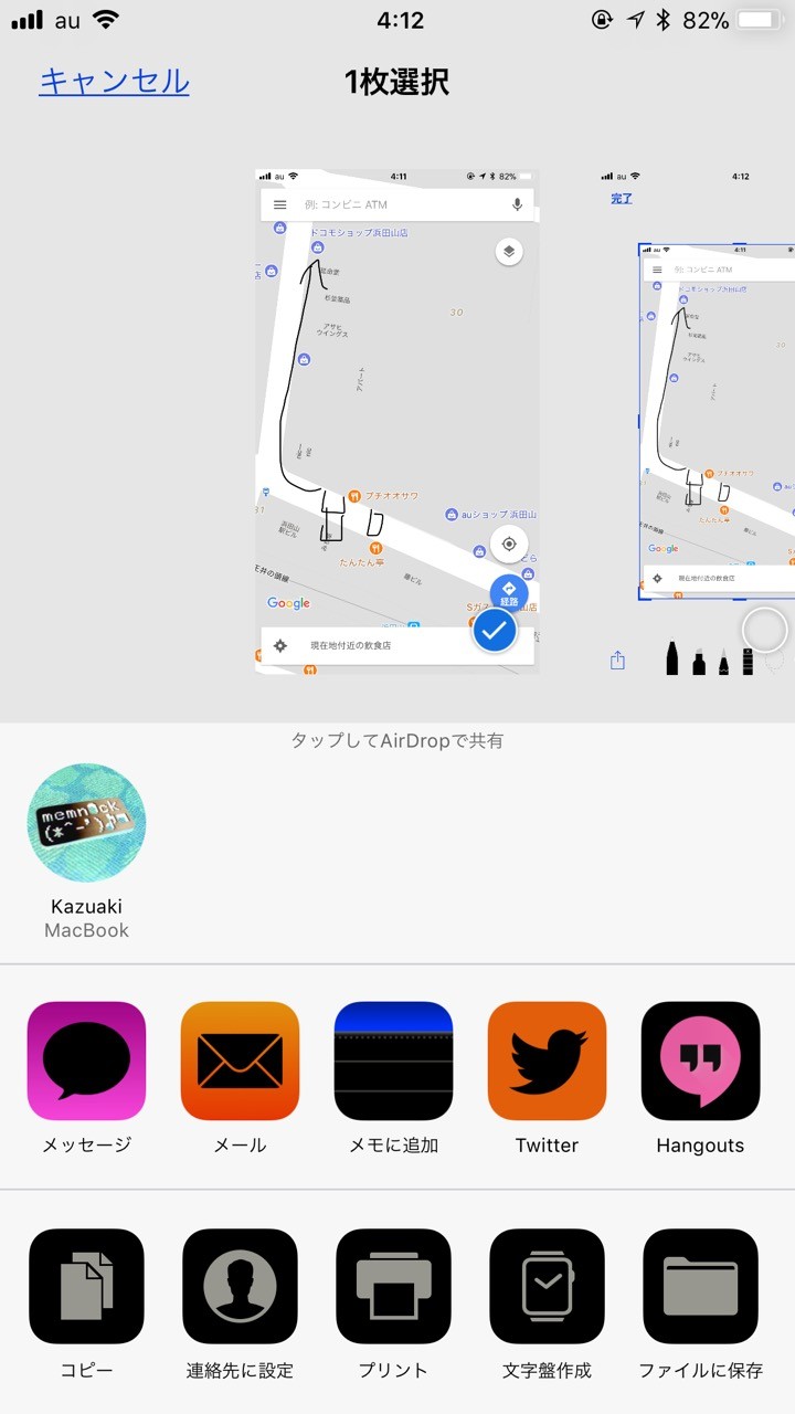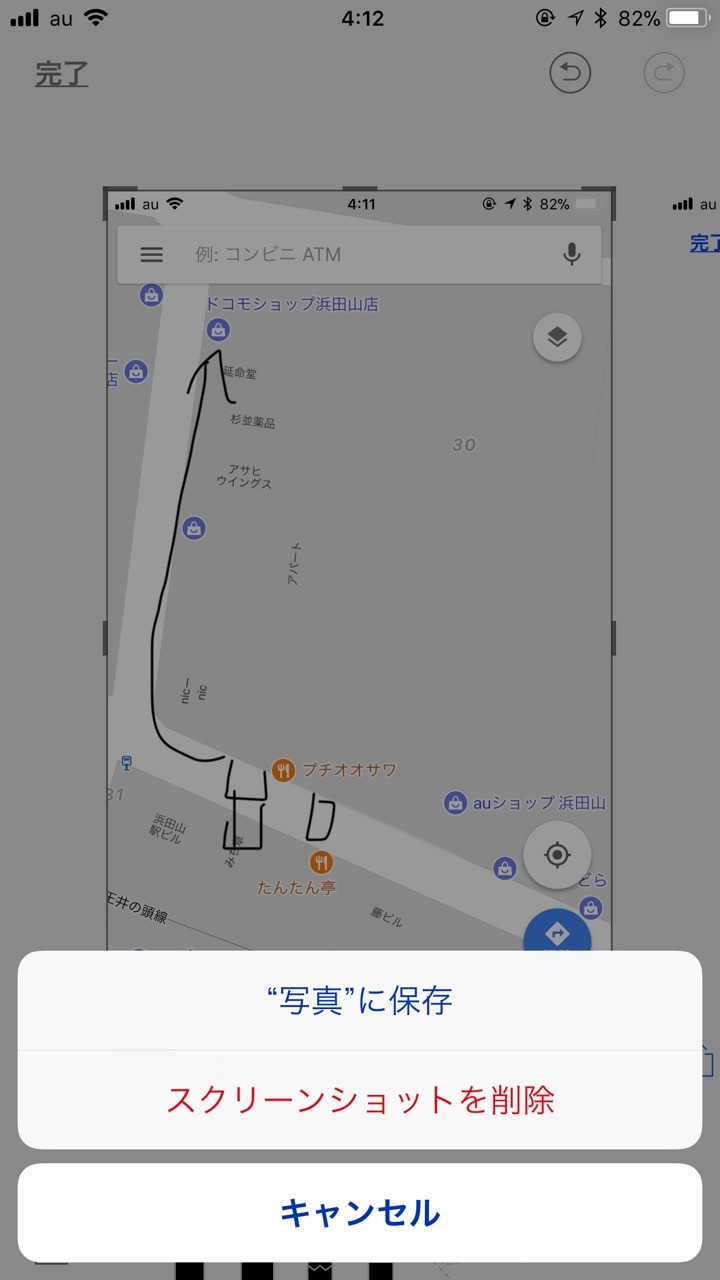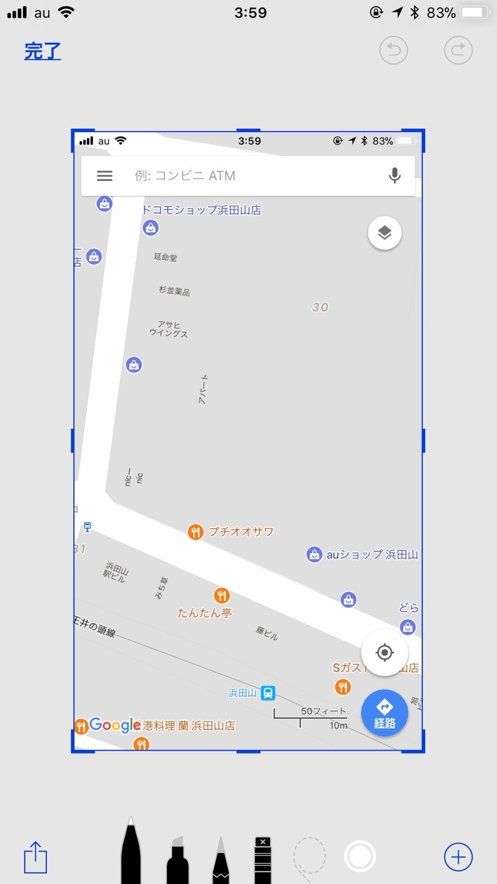 例えば、地図アプリの画面をスクリーンショットで撮影し、道順などをペンで描いて待ち合わせ相手に送ったりといったことがより簡単にできるようになります。画像編集が終わったら左上の「完了」を押せば保存できるほか、左下にある共有ボタンを押せばそのまますぐにメールなどで送る事が可能です。