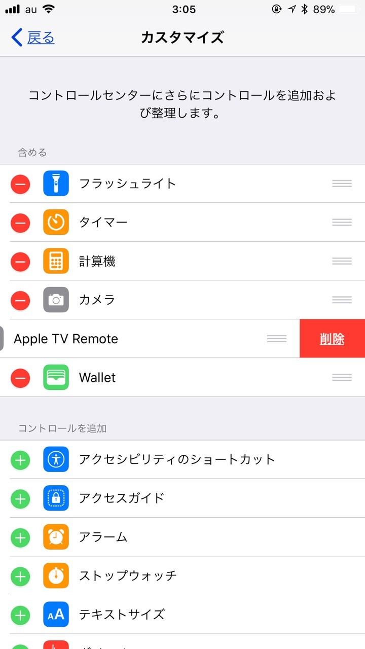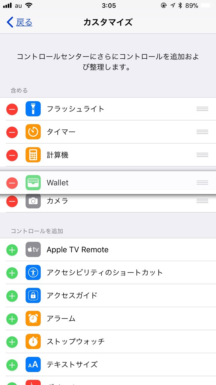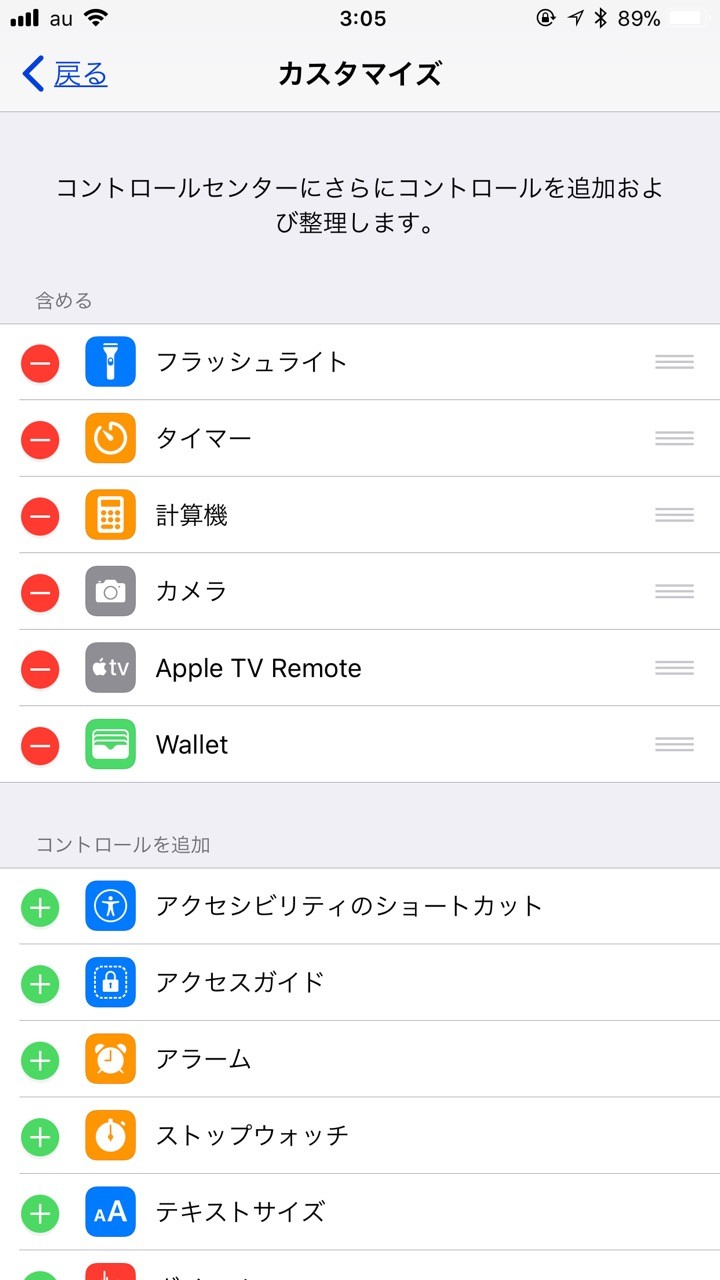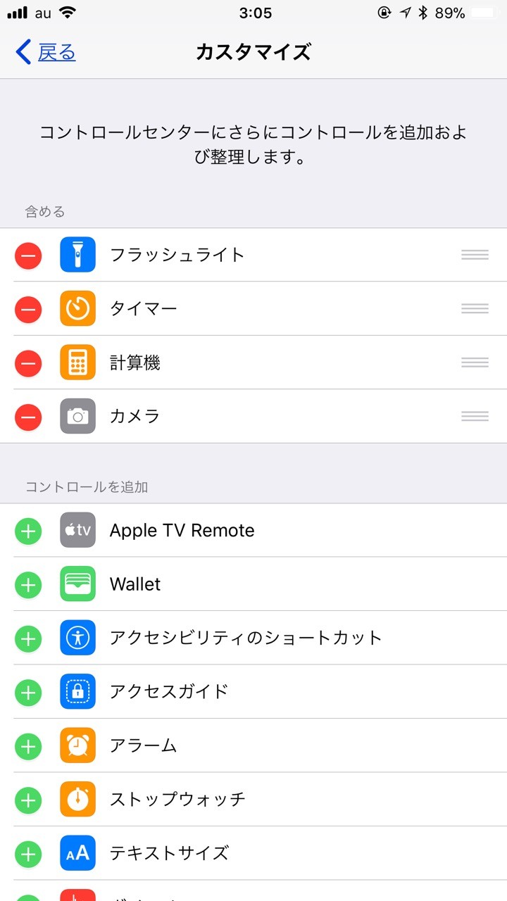またコントロールセンターのショートカットボタンは編集でき、「設定」→「コントロールセンター」→「コントロールをカスタマイズ」にて最初に登録されている「カメラ」や「電卓」、「タイマー」、「フラッシュ」以外に「アラーム」や「Wallet」、「メモ」、「ボイスメモ」、「画面録画」などの機能を追加し、ボタン配置も編集可能となっています。