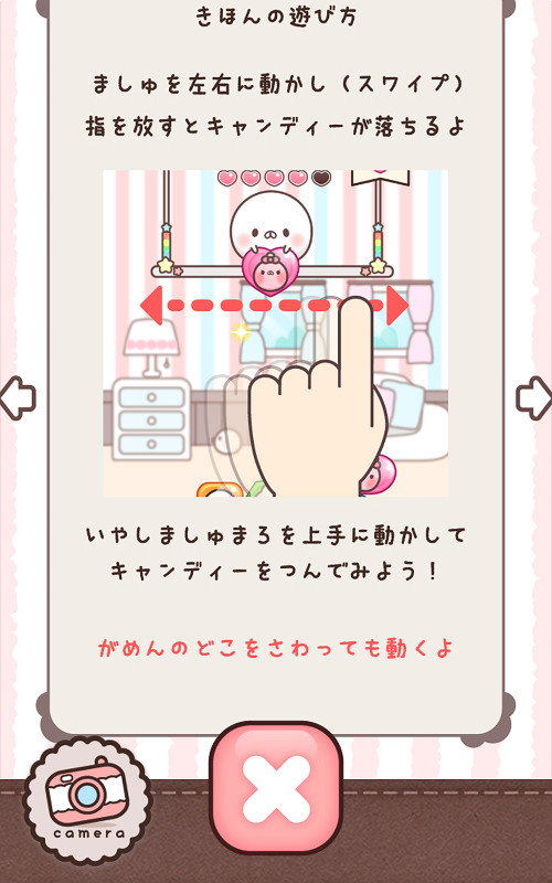 ルールとしては、画面上側にいるいやしましゅまろを操作して、上からキャンディ(ブロック)を落としていきます。
