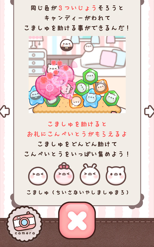 キャンディを消すことで、キャンディの中にいる小さいいやしましゅまろ(こましゅ)を集めていきます。