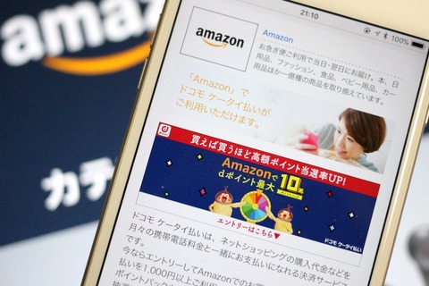 NTTドコモが総合オンラインストア「Amazon.co.jp」にて同社の毎月の携帯電話料金と一緒に合算して支払える決済サービス「ドコモ ケータイ払い」で1,000円以上の支払いをすると最大10%のdポイント(期間・用途限定)が還元されるキャンペーン( https://ent.smt.docomo.ne.jp/keitai_payment/shop/shop_amazon.html )を実施しています。