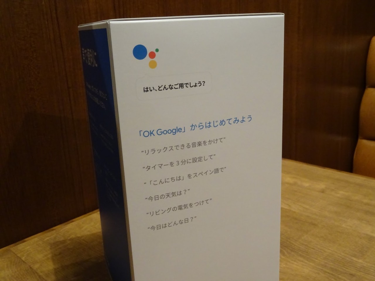 まず化粧箱は至ってシンプルに仕上がっており、側面では各種音声コマンドの紹介がなされています。音声コメンドでは例えば、「OK Google(オーケー グーグル)、東京から新宿まで電車で」と話しかければ、Google Homeがインターネット上のビックデータを介して最適なルートを検出し、音声で案内してくれる機能などは特に実用的です。