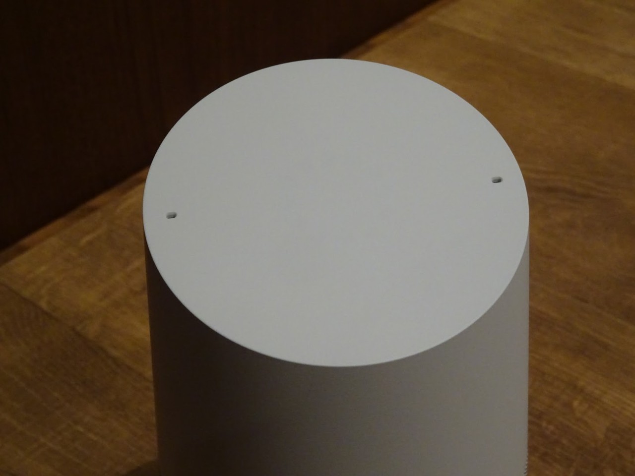 本体上部は一見、白一色で何も配置されていない印象を受けますが、内部には円形にLEDが配置されており、内蔵されたタッチセンサーを用いてGoogle Homeを直接的に操作することも可能です。しかしながら、音声で「OK Google、○○して」といった感じで大抵の操作をすることが可能なので、軽く触った限りではそこまで大きい存在意義があるという訳でもない印象を受けました。