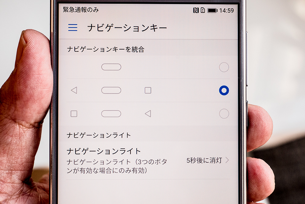 ナビゲーションキーは画面外のタッチセンサーに集約。戻るキー、履歴キーの左右入れ替えが可能なほか、HUAWEI P10シリーズに搭載されたホームキーだけで戻る、履歴、ホームキー3つを使い分けるジェスチャーに対応する。このワンキー操作はシンプルで使い勝手が良い。