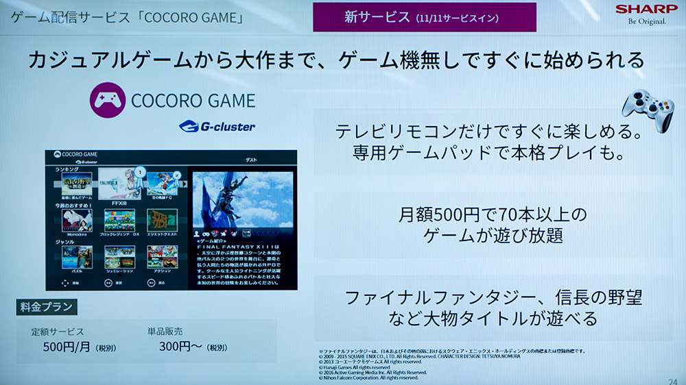 ビデオや音楽だけではなく、G-Clusterのゲーム配信サービスに対応し「COCORO GAME」として、大作ゲームを楽しむことができる。簡単な操作はリモコンでも可能だが、Bluetooth接続のゲームパッドを利用することで、ゲーム機に近い操作感でゲームが楽しめる。
