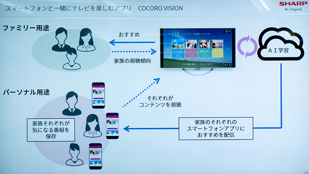 例えば、人感センサーが人を検知すると電源がオンとなりCOCORO VISIONが家族を対象とした番組やデジタルコンテンツのレコメンドを行う。これまでのテレビは放送波を表示して観たい番組を調べるという視聴方法が主だったが、COCORO VISIONはAQUOS 4Kがさまざまなコンテンツの入り口となるよう利用者の”気づき”を重視している。