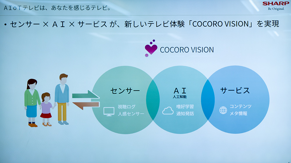AQUOS 4Kに搭載されるCOCORO VISIONは「人感センサー」と「視聴ログ」、そしてAIによる「嗜好学習」と「通知発話」、バックグラウンドにはこれを紐付けるためのさまざまな「コンテンツ」と「メタ情報」を持つサービスだ。