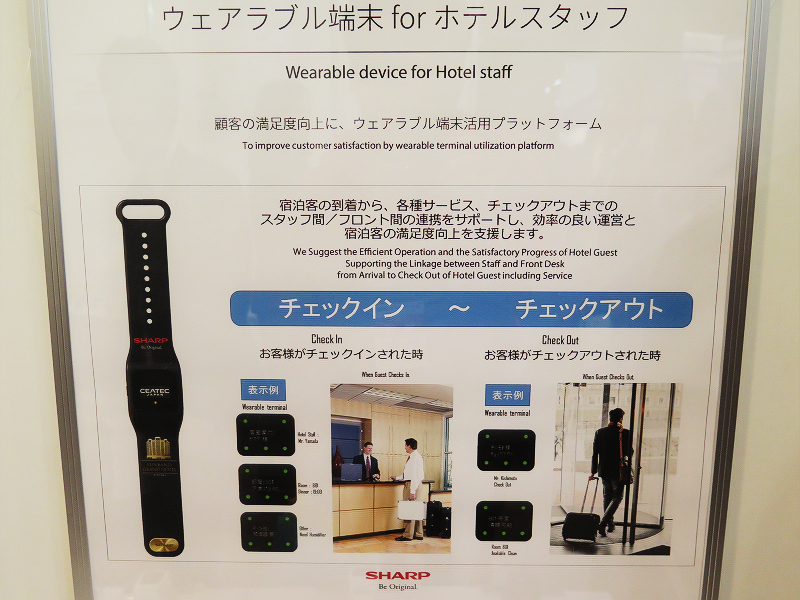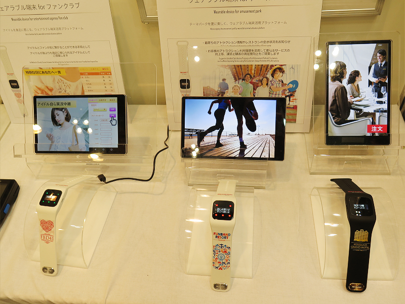 シャープのブースでは、サッカーや野球などのスポーツチームの応援・情報共有用のファンアイテムとして現在発売中の「funband」の法人や団体に向けたカスタムモデルのサンプル機が展示されていました。展示されていたfunbandのカスタム例には「ホテル従業員向け」や「遊園地などのテーマパーク向け」、「アイドルや芸能人などのファンクラブ向け」の3種類が展示されていました。
