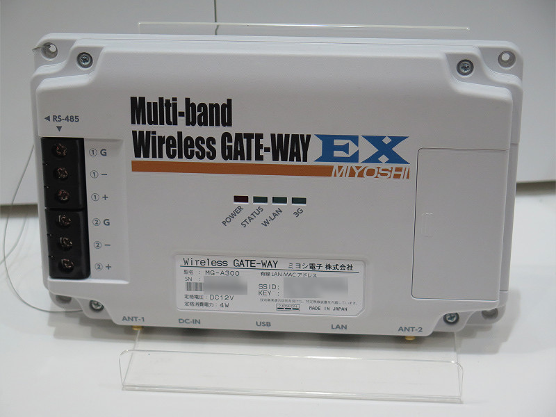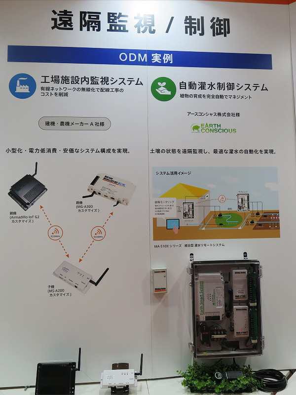 過去にはコンシューマ向けにPHS製品(主にASTEL向けPHS音声機種やウィルコム向けW-SIM対応機器など)を提供していたこともあるミヨシ電子のブースではLTEおよびW-CDMA、またはLPWA(LoRaWANなどの特定小電力無線の「Low Power Wide Area」のこと)に対応した「ワイヤレスゲートウェイEX」が展示されていました。ワイヤレスゲートウェイEXは前述通り、LTE・W-CDMA版とLPWA(LoRaWAN)版の2種類があり、顧客の要望に応じてどちらかの仕様にして提供されるそうです。また別売りのマルチIFユニットなどを接続(無線・有線)し、複数の機器の通信を一括してまとめて行うこともできます。