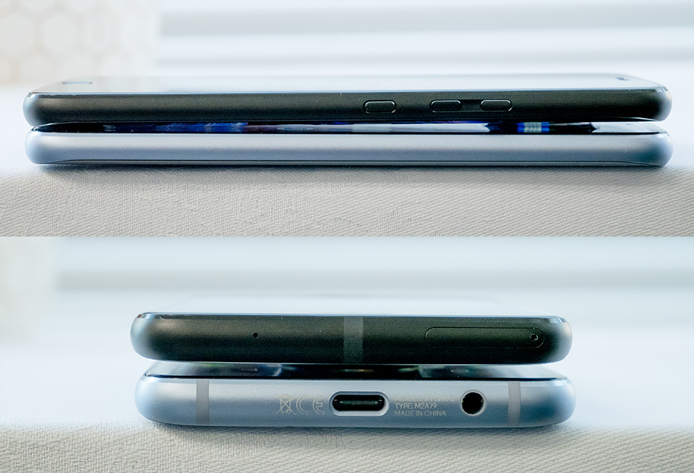本体右側面(写真=上上段)には電源キーと音量上下キーが配置され、左側面(写真=上下段)には何もない。また本体上側面(写真=下上段)にはSIMカードスロットおよびmicroSDXCカードスロット(最大2TBまで)、下面(写真=下下段)にはUSB Type-C端子および3.5mmイヤホンマイク端子がある。