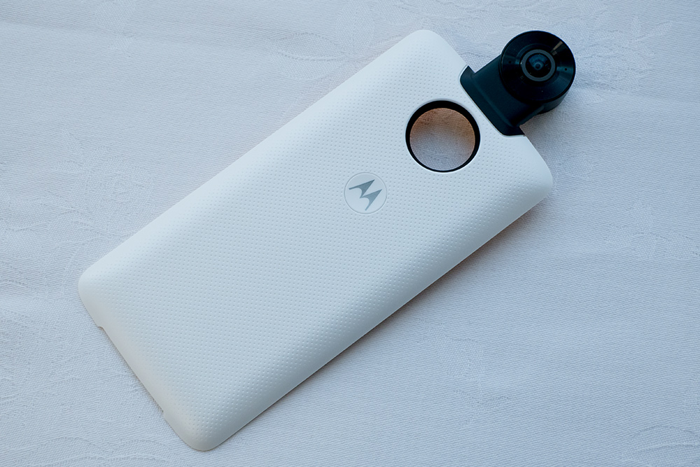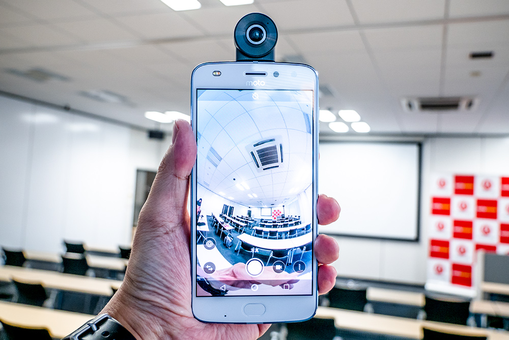 Moto 360 カメラは360°の静止画・動画撮影を可能なカメラ機能を追加できるMoto Modsだ。スマホの利点を活かして、360°カメラによるライブ配信や、撮ってすぐSNSや動画投稿サイトへ共有することができる。