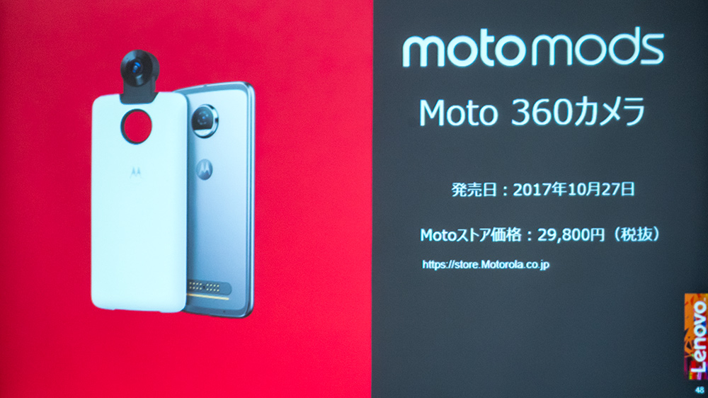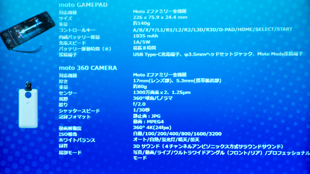 今回発表となったMoto Modsは「Moto ゲームパッド」と「Moto 360 カメラ」の2製品。なお、Moto ModsはMoto Zシリーズ専用で、Moto GシリーズおよびMoto Xシリーズでは利用できないので注意して欲しい。