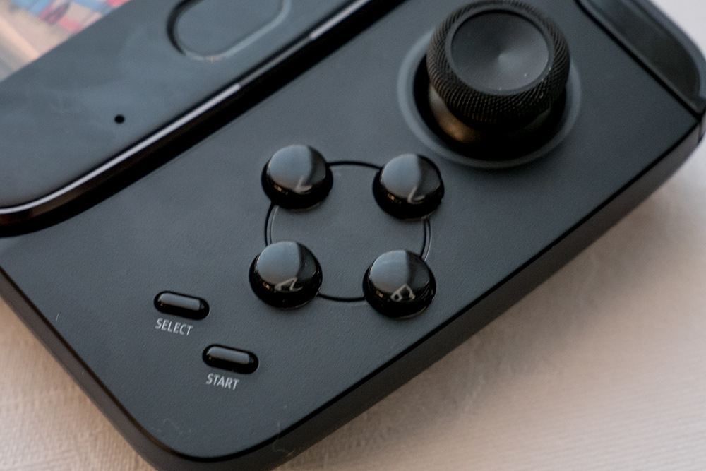 右側にはSTARTボタン、セレクトボタン、4つのボタンがあり、ゲーム機感覚でプレイ可能だ。